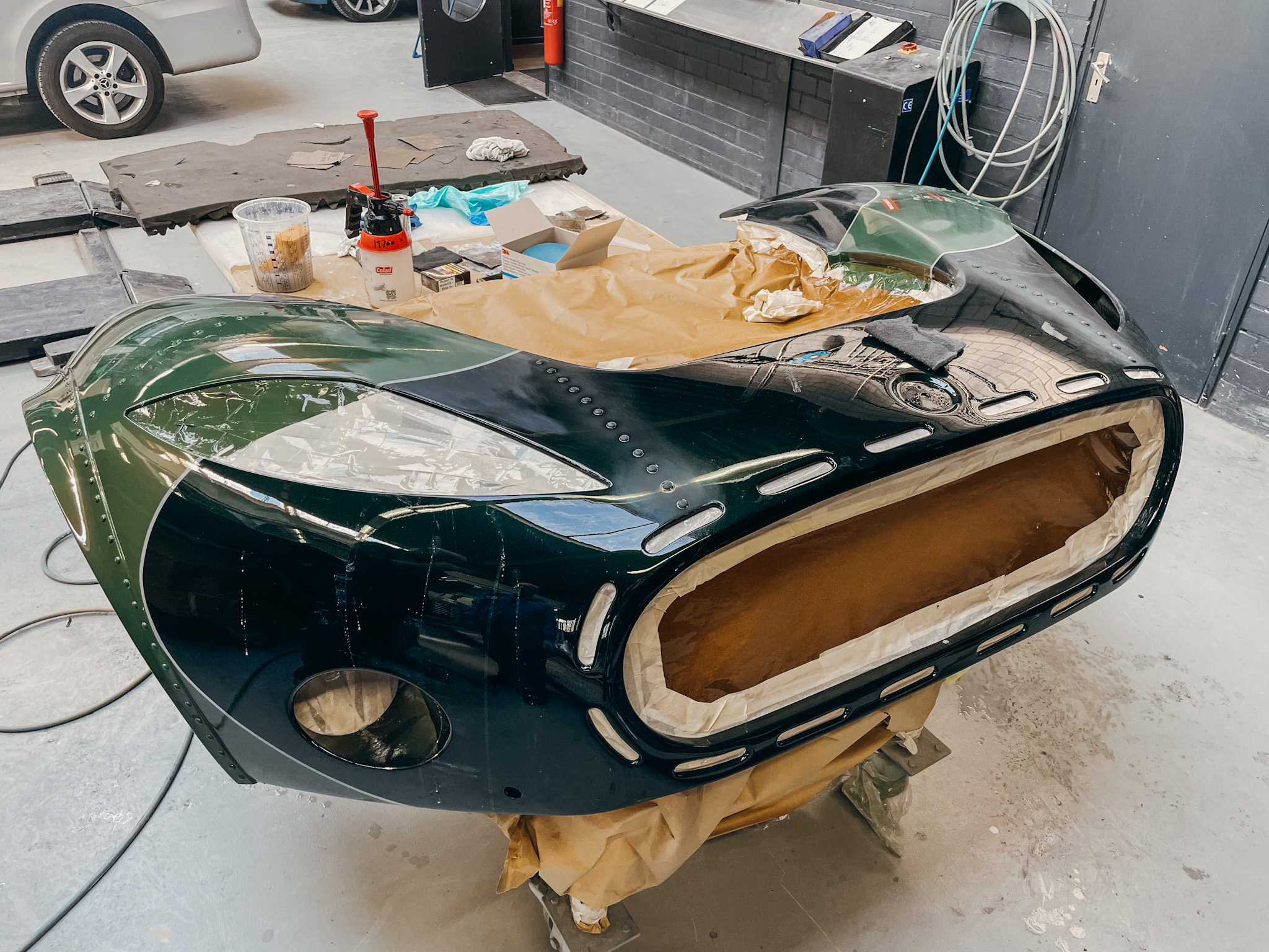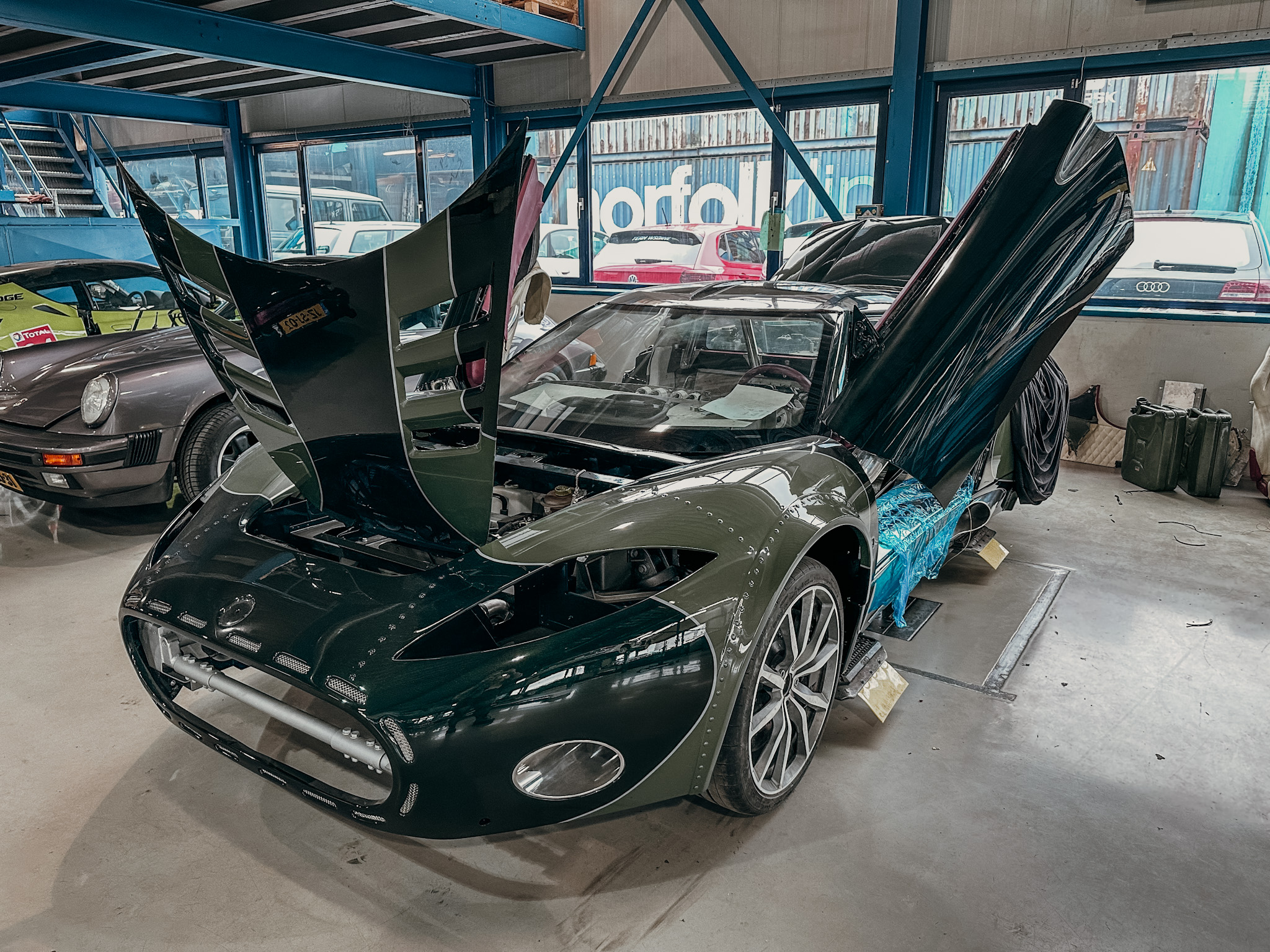 This Aileron came to us in 2021 and is a project from one of our customers, it started off as a black prototype which they equipped with a 700hp GM engine, this is the only manual transmission Aileron ever build. The owner gave us the task to make it a one of a kind Aileron. A lot of changes were made on this Spyker like; Added rivets, wide body, all tubes replaced with C8 tubes, La Turbie front, quad exhaust, and much more unique upgrades! The paint job that we did is inspired by the LM85 Laviolette, but then in a different color sceme.